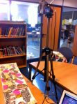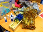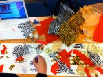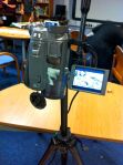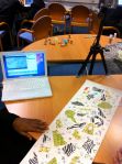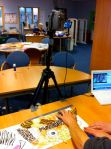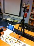John and Shelley set up in library. Informal atmosphere. 5 tables equipped with camcorders on tripods a vertical axis looking down on the tables. Duct tape everywhere for stability and H&S. 5 x Macbooks with I Can Animate running. 3 students per table. Plenty of colourful craft material: tissue paper, pens, newspapers etc on separate table.
